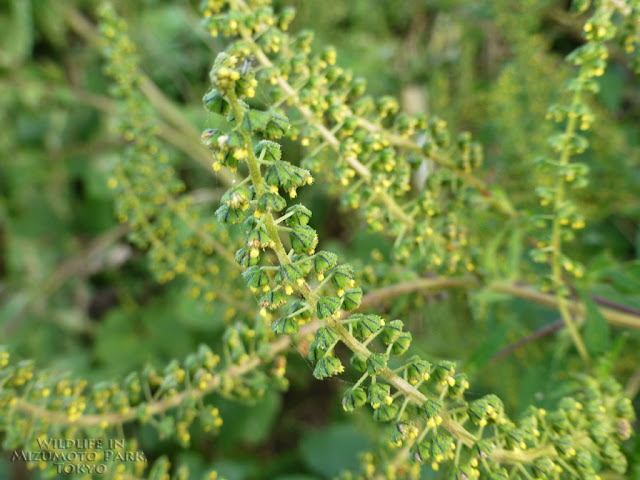 ここのオオブタクサはよく育っており,高さは3mぐらいでしょうか.中央広場以外でも,園内のあちこちの日当たりのよい場所に見られます.条件が良いと最大でなんと6mにもなるそうです(参考1,3).