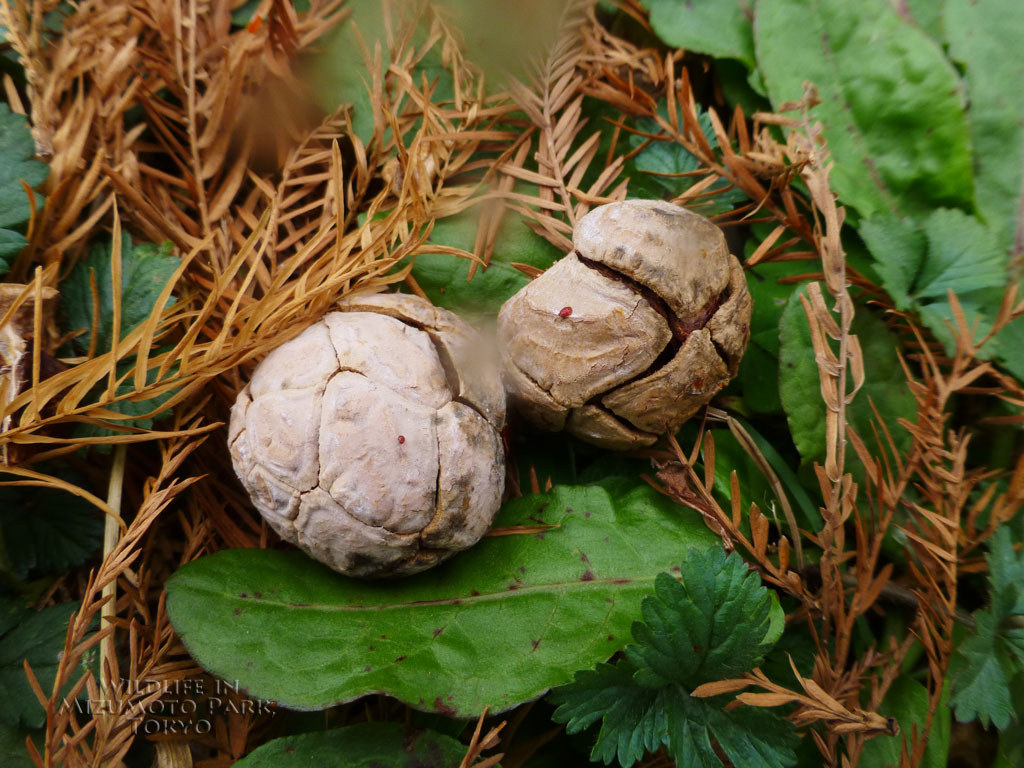 橋の近くのラクウショウの木の下に,実がたくさん落ちていました.大きな丸い実で,かなり殻が硬そうに見えます.殻の表面には溝が見えていて,鱗片のように分かれそうです.「爆丸」(タカラトミー)という子供のおもちゃを思い出しました.小鳥が食べていますので,どのように食べるのかなと実を分解してみました.
